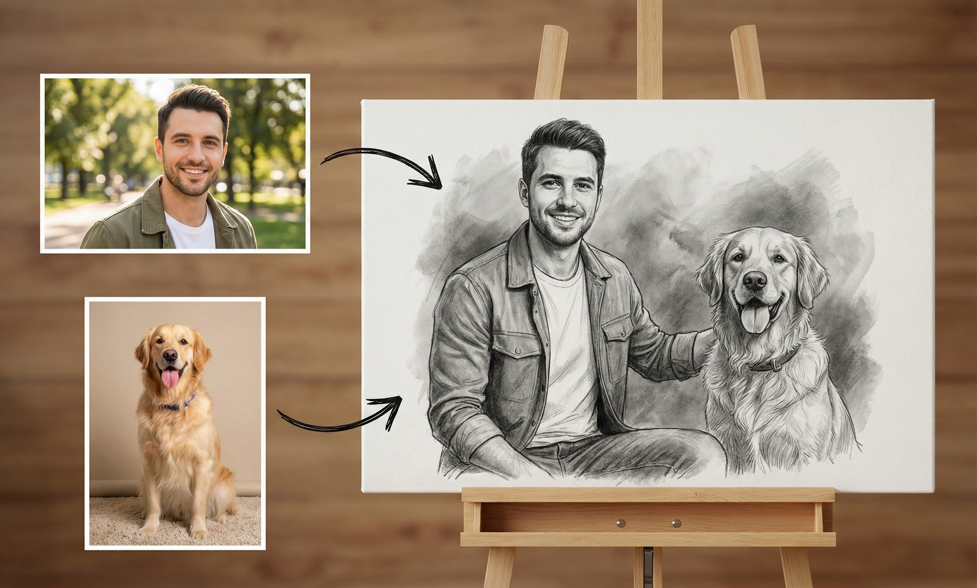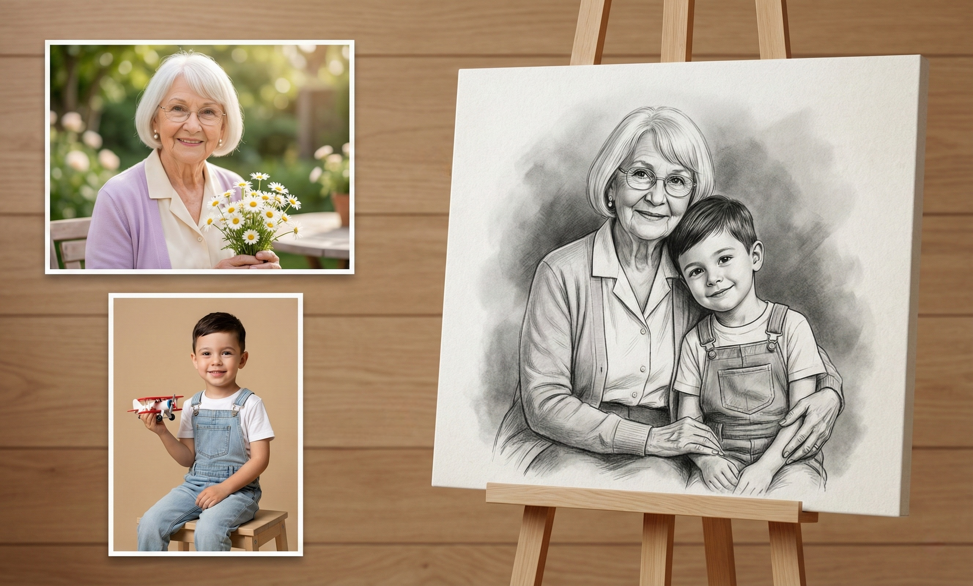 We specialize in merging multiple photos into one seamless, hand-drawn style charcoal sketch. Whether it's bringing a family back together, honoring a deceased loved one, or including a beloved pet, we create the perfect moment that never happened—until now.